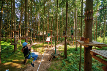 Eine Herausforderung für die ganze Familie: Zehn Parcours, von denen zwei für Kinder ab 4 Jahren geeignet sind, bieten mit klangvollen Namen wie Piraten- oder Shaolin-Parcours echtes Abenteuer-Feeling und für jeden den richtigen Kick, auch ohne Vorkenntnisse.